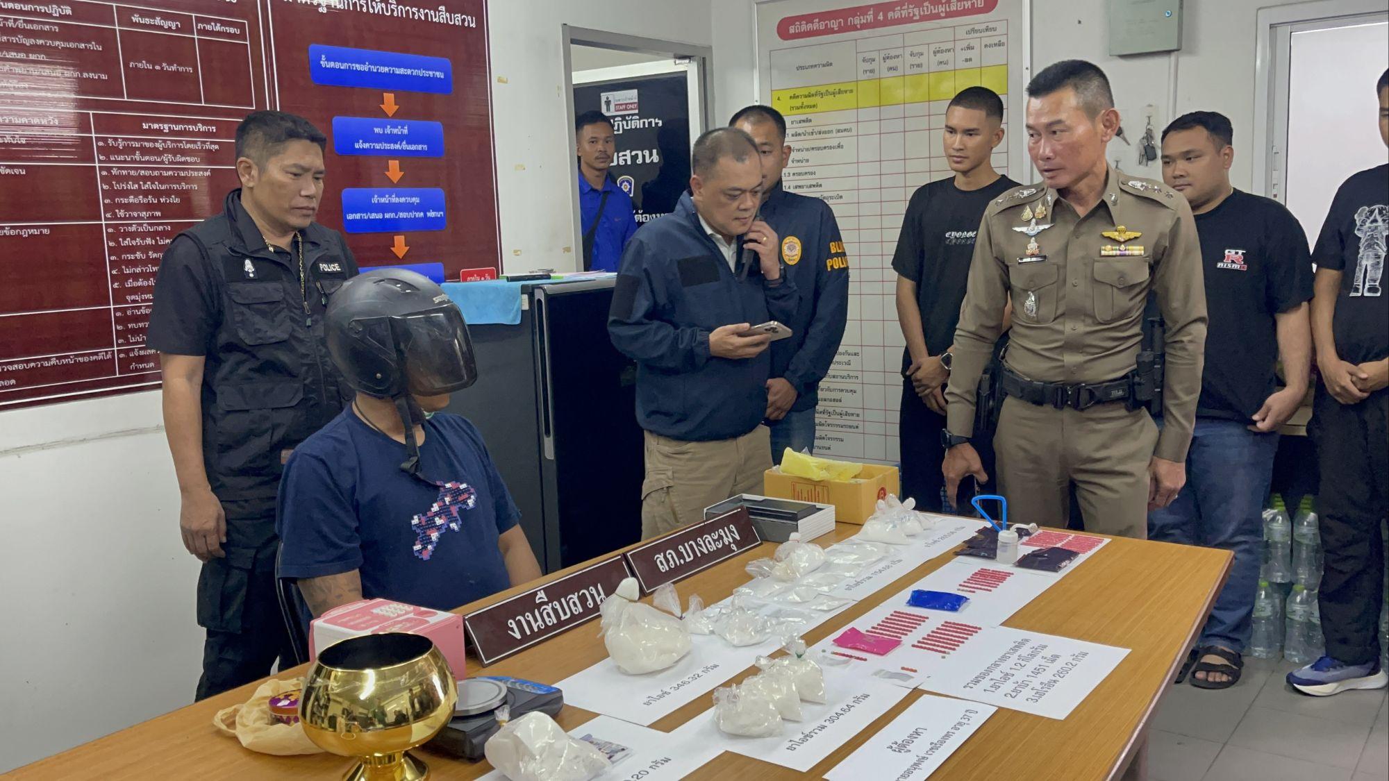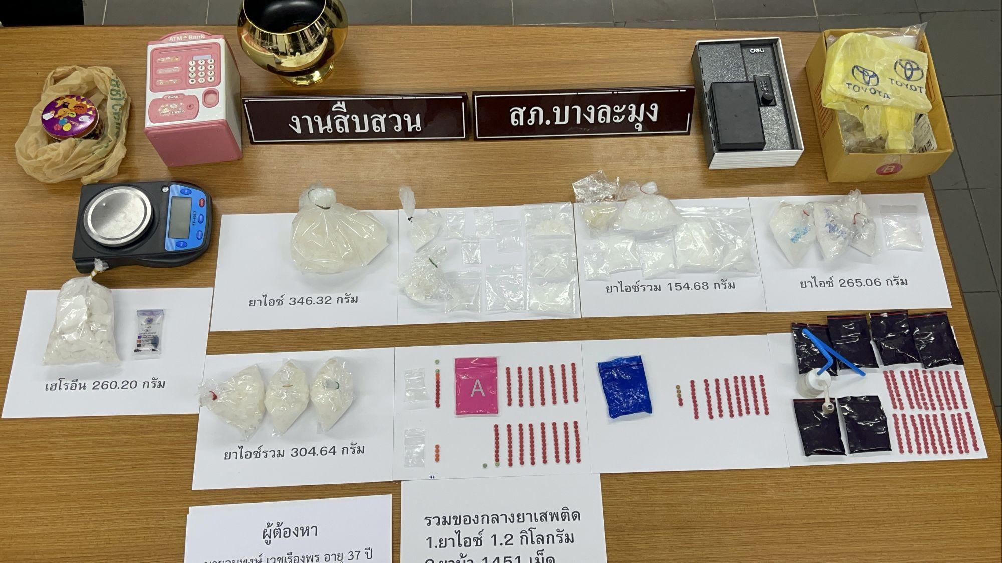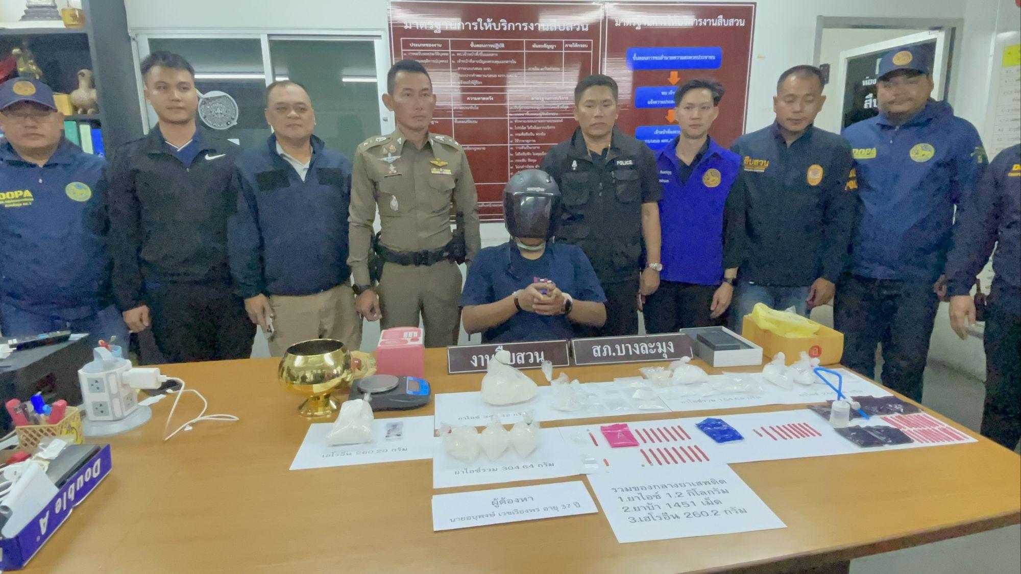 Funkcjonariusze z komisariatu policji Banglamung w prowincji Chonburi udali się do stolicy wczesnym rankiem w środę i aresztowali 37-letniego podejrzanego o przemyt narkotyków, zabezpieczając ponad kilogram krystalicznej metamfetaminy („ice”), 260 gramów heroiny i 1,500 tabletek metamfetaminy („yaba”).